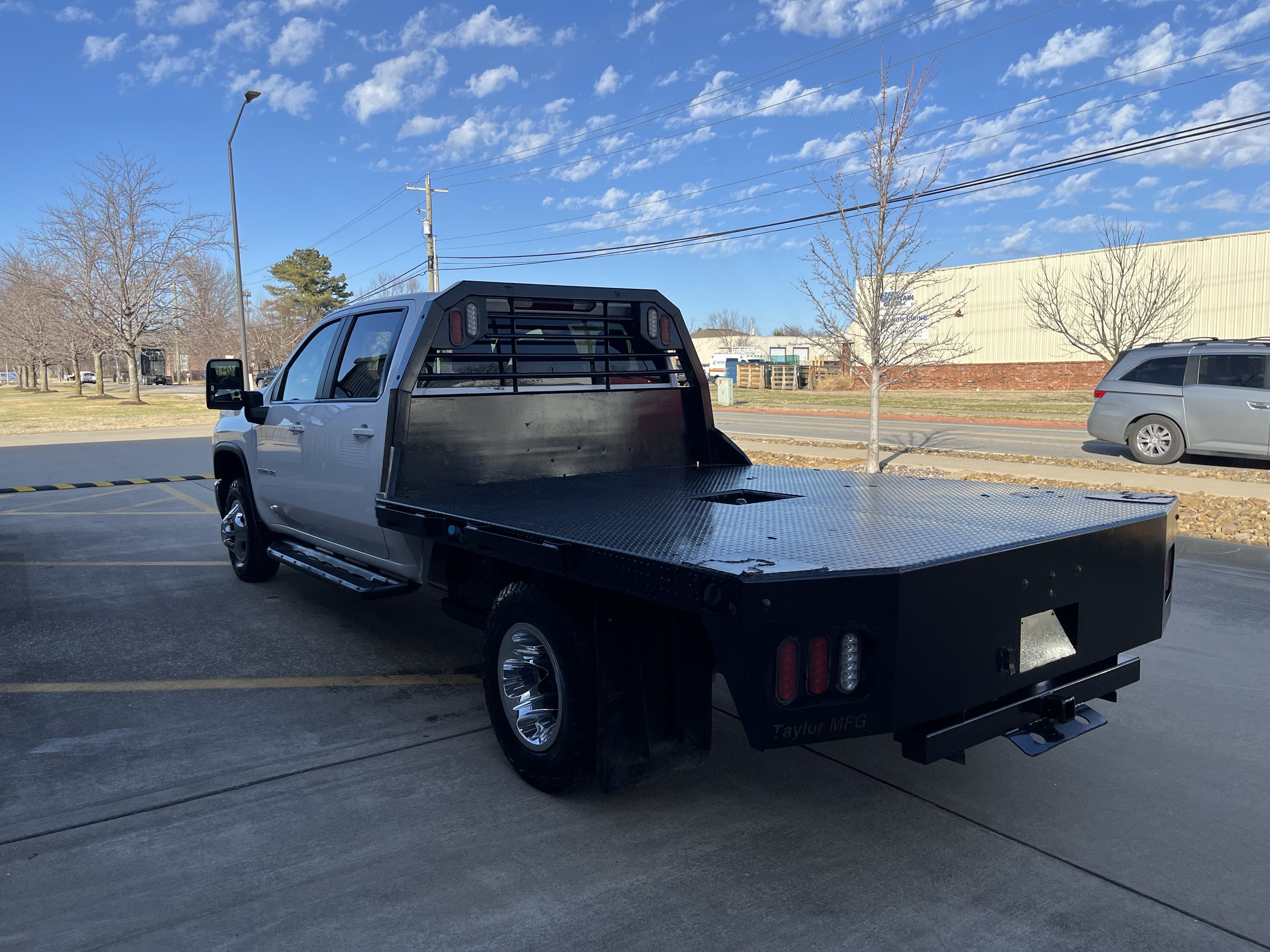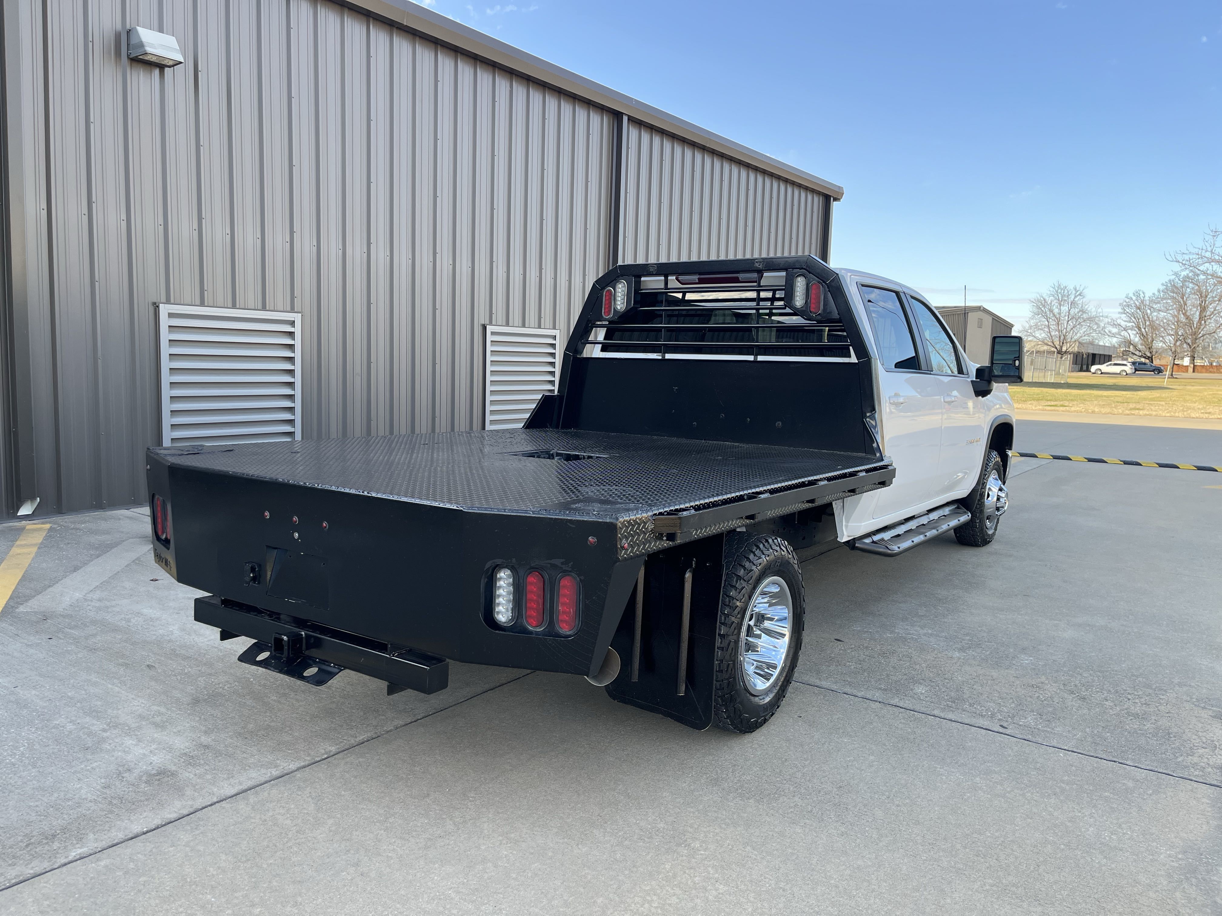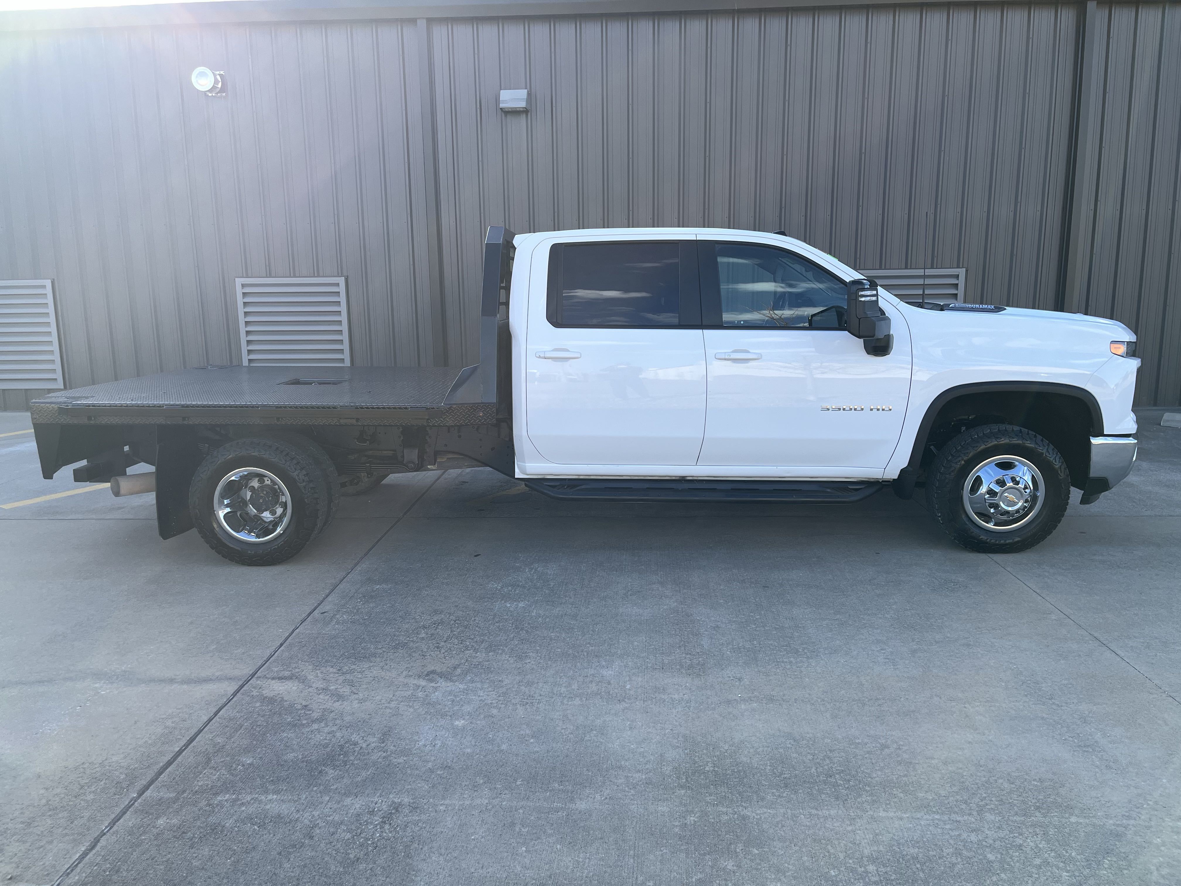 2024 Chevrolet Silverado 3500 flatbed with 6.6 Duramax, Allison transmission, and only 128K miles! 4x4, Dual rear wheels, charcoal colored cloth seats, easy to clean rubber floors, cold AC, large media control console, cruise control, back up cameras and much, much, more!